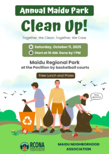 The Maidu Neighborhood Association meets at 6:30 p.m. on the 4th Tuesday of each month except November (when we meet the 3rd Tuesday if the 4th Tuesday is the same week as Thanksgiving) and December (no meeting in December or if the Board approves a change). We meet in the Activity Room to the left side of the front of Sargeant School.
